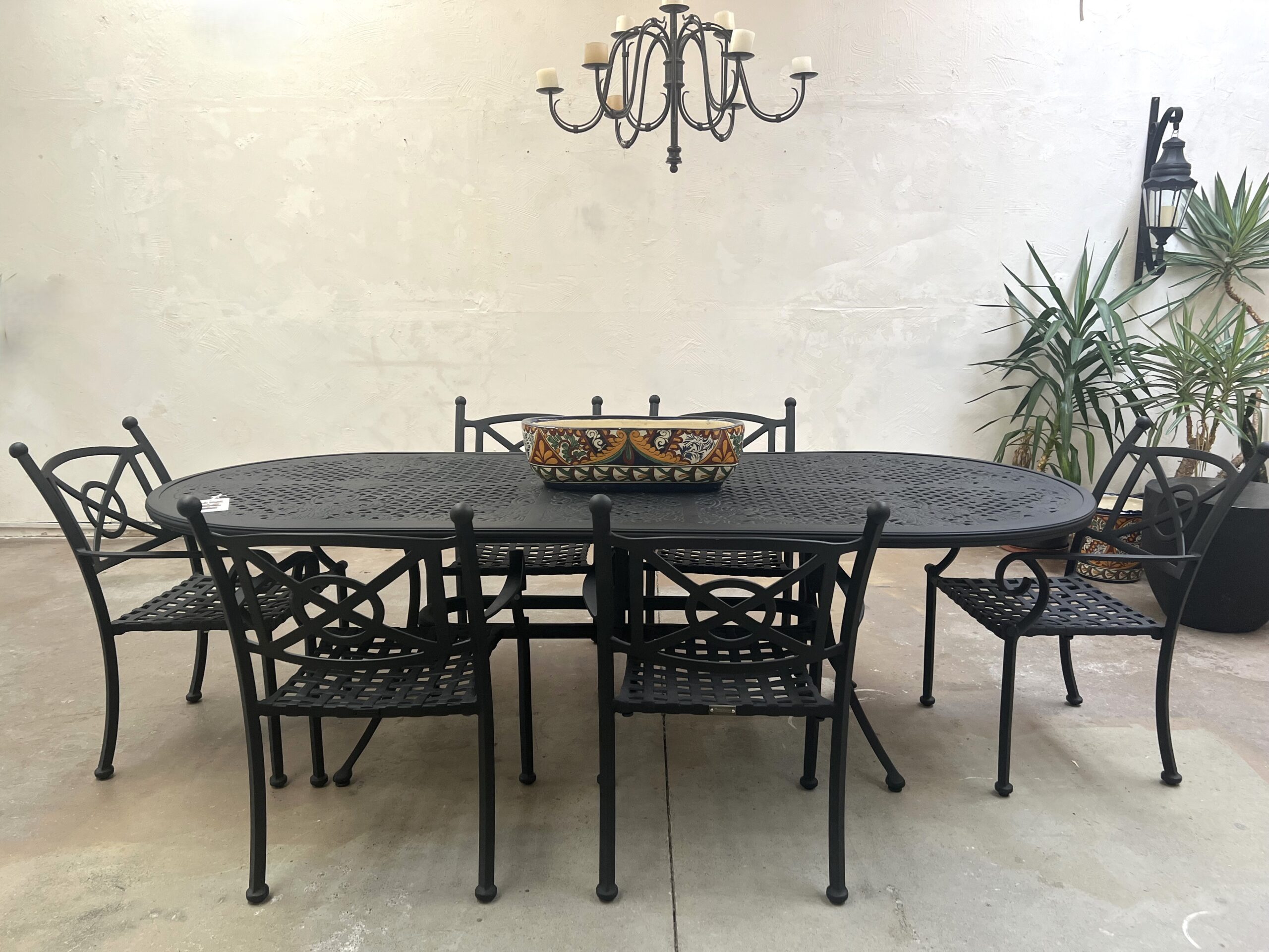 Bring timeless style to your outdoor living space with the Luxury Santorini 2.5m x 1.06m Oval Dining Table with 6 Dining Chairs .